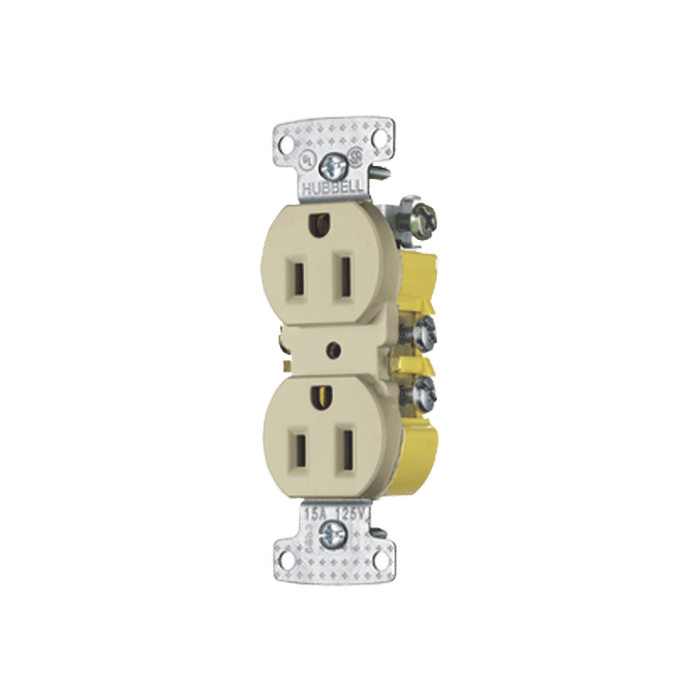 Dispositivos de hoja recta, receptáculo grado residencial, dúplex, 15A125V, conexión a tierra de 2 polos y 3 cables, 5-15R, terminales de empuje, color marfil.