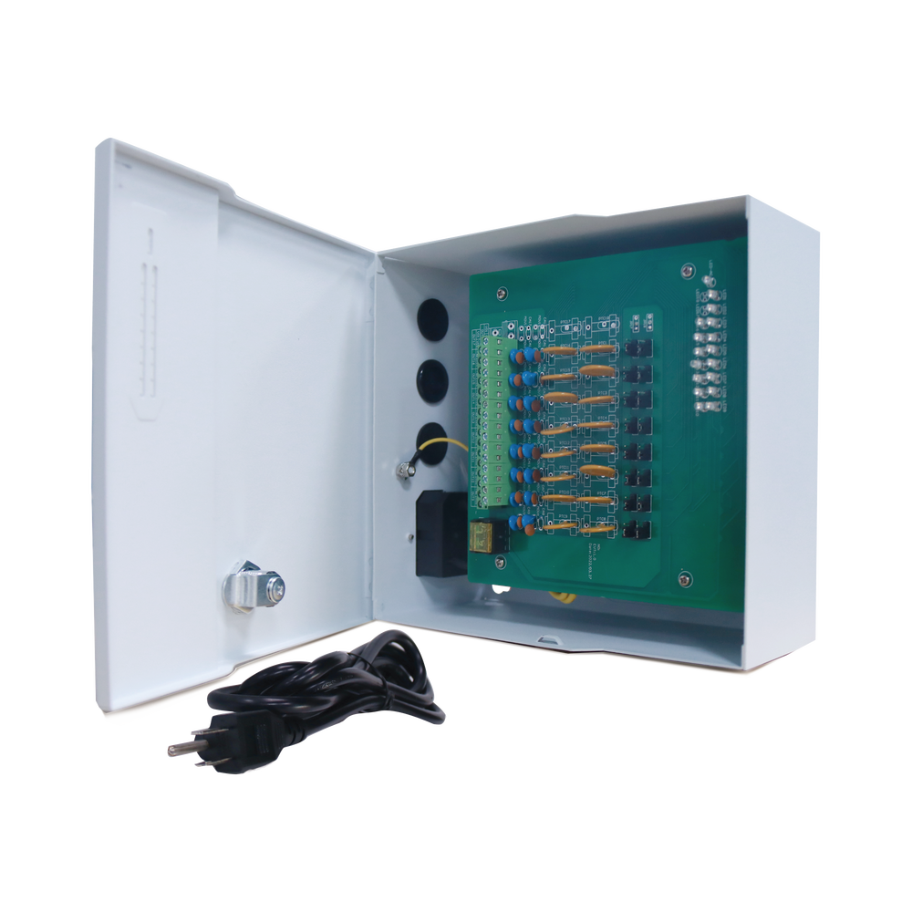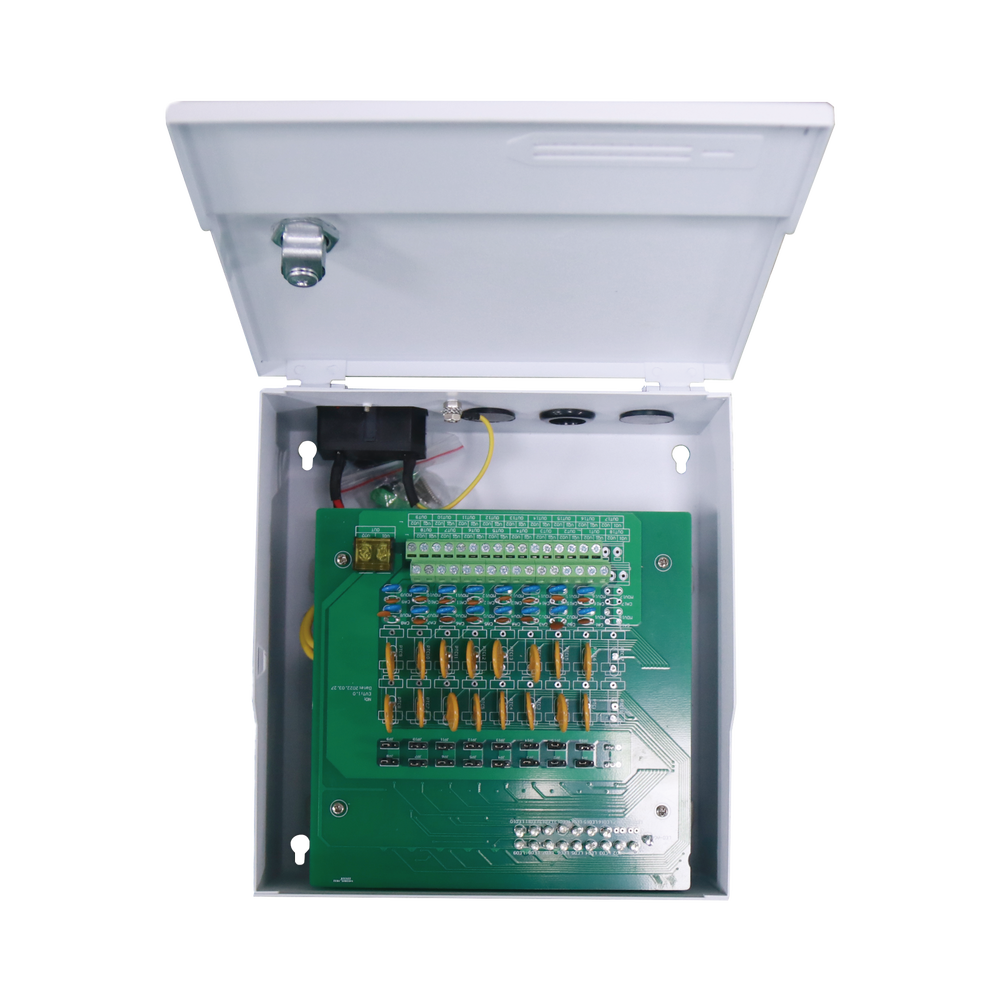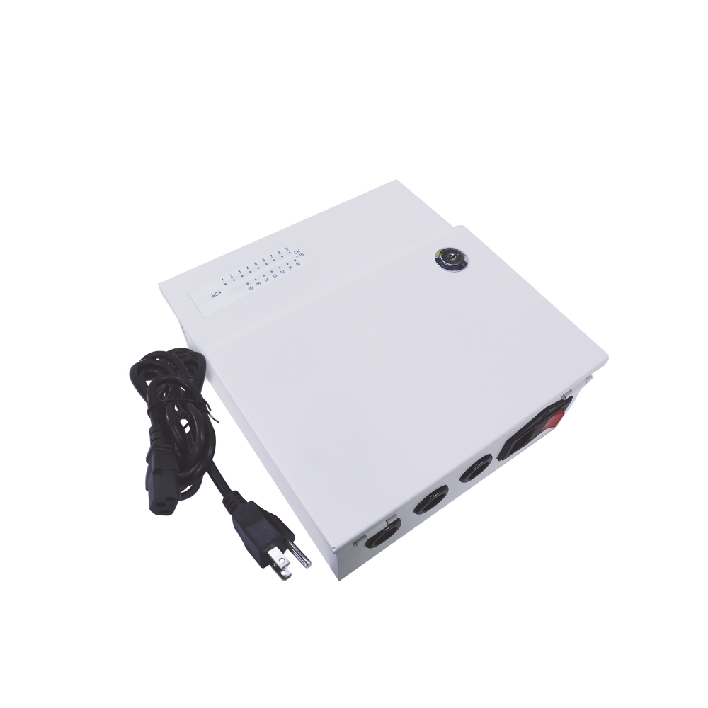 Fuente de Poder con ajuste de voltaje de 11- 15 Vcc / 10 A / 9 Salidas / Capacidad de Batería de Respaldo / Requiere Batería / Voltaje de Entrada 96-264 Vca