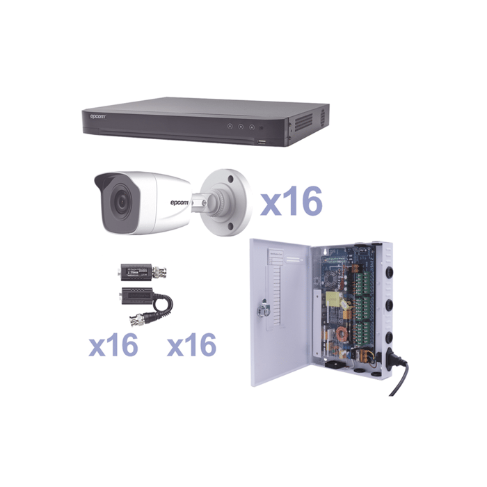 KIT TurboHD 1080p / DVR 16 Canales / 16 Cámaras Bala (exterior 2.8 mm) / Transceptores / Conectores / Fuente de Poder Profesional