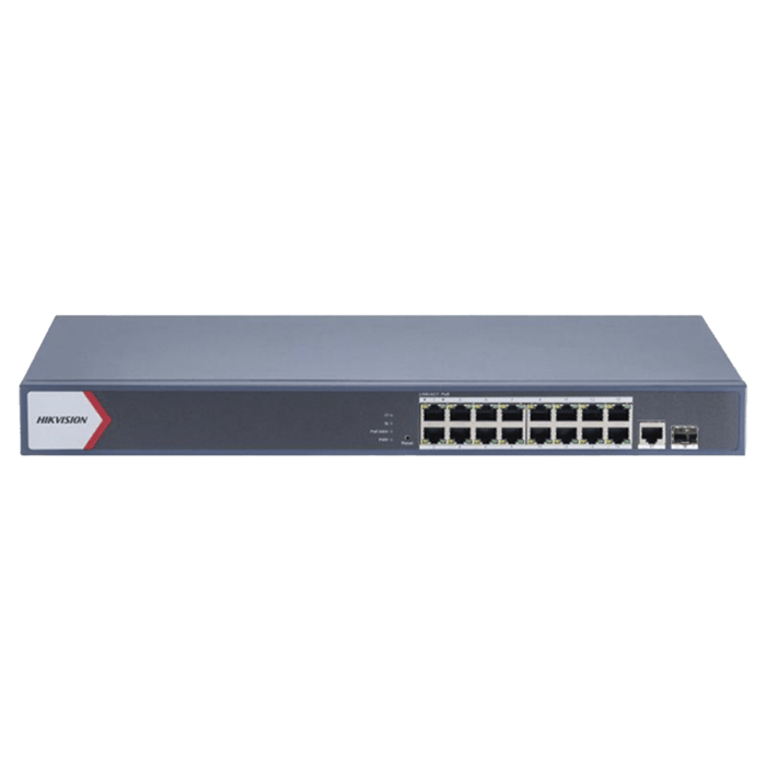 Switch Gigabit PoE+ / Monitoreable / 16 Puertos 1000 Mbps PoE+ / 1 Puerto 1000 Mbps de Uplink / 1 Puerto SFP / Configuración Nube desde Hik-PartnerPro / Modo Extendido hasta 300 Metros / 130 Watts