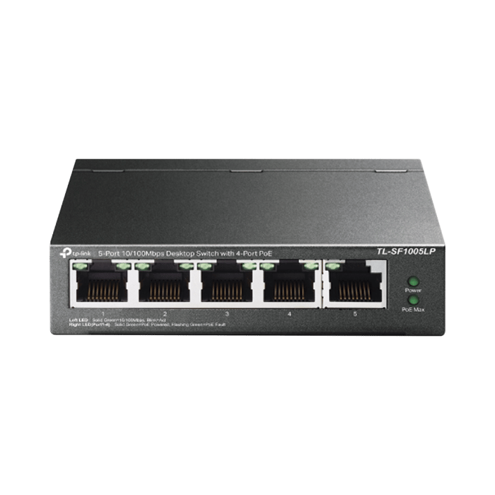 Switch PoE No Administrable de Escritorio / 5 puertos 10/100 Mbps / 4 puertos PoE af / Presupuesto 41 W / Modo extensor PoE hasta 250 metros / Calidad video prioritaria